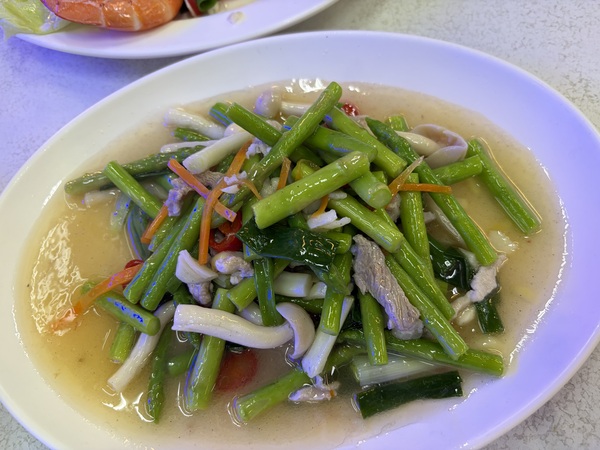 * 蘆筍炒肉絲花枝: 吃了那麼多海鮮,當然要來點青菜。鮮脆的綠蘆筍配上花枝和肉絲大火快炒,清爽又解膩。