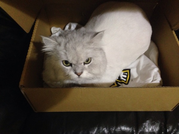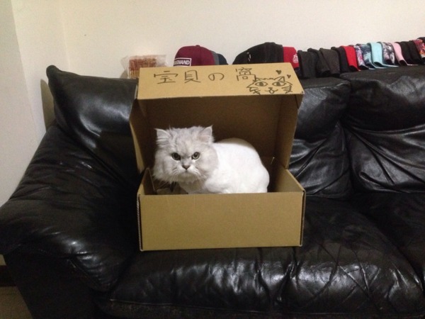下班時我把我的外套抽走,寶貝還發出抗議的喵聲,我快笑翻了哈哈 只好給他戴上我桌上禮贈品的毛帽意思意思~不過他看起來還是很不爽XDD ↓