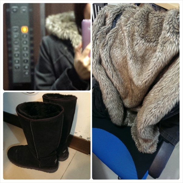 好久不見的雪靴重出江湖(沒錯,就是我穿去日本那雙), 再加上我的厚毛外套(Ryan哥說我披了一頭熊在我身上,哈),上班去~ 這樣穿真的很暖和(只是很笨重而以),裡面只要穿平常冬天的衣服就好.... 好笑的是,我上班都把我外套(如上圖右)披在椅子上,有時候還可以往後靠, 超軟超舒服~~~~