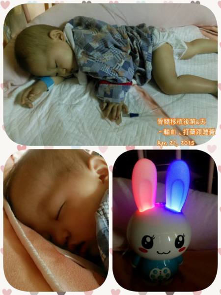 骨髓移植後第6天~輸血、打藥跟睡覺 今天清晨抽血的指數依舊是恐怖數字,白血球:50,血紅素:6.3,血小板:44000,代表昨晚輸的血紅素還是不夠,今天中午要再輸ㄧ次血紅素,其實移植中心主要照顧的病患都是成人居多,所以護理師對於兒科的病患經驗比較少,像寶貝這麼小的移植者更少,每次要輸血紅素都只有輸60cc左右,對於沒有專門的輸血幫浦機器的移植中心來說,真的要很小心的注意輸血狀況,最後有位熱心的白班護士終於決定去向小兒加護病房借來一台給小兒輸血的機器,才讓媽咪我放心不少。但今天主治醫師決定要幫寶貝加上營養針了,因為昨天整天幾乎沒吃,然後開始可怕的腹瀉惡夢來到,醫生說腹瀉是ㄧ定會發生的,可能是化療副作用或是移植排斥現象,所以寶貝顯得很累很累ㄧ直睡,感覺她這兩三天應該是超級不舒服,為了逗她開心,我上網買了ㄧ臺幼福小兔歌謠說故事機,請拔拔帶來醫院,希望她笑容可以回來,但效果失敗,連新玩具她都不要玩,只要我陪她躺在床上,我ㄧ離開床她就哭了,所以在她變舒服點之前,我就是跟她黏著,繼續妳濃我濃,相親相愛最高點。我們要撐過這禮拜血球低潮,媽咪相信妳可以的,加油!我的小甜心。