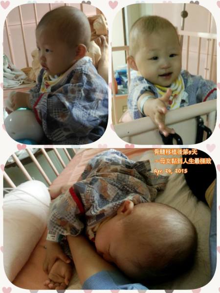骨髓移植後第9天~母女倆黏到人生最極致 進入移植後第9天了,醫生預估下週開始,血球應該就會開始往上爬,媽咪我真是期盼不已,因為移植這條路真的好艱辛,寶貝本來因為化療導致胃口就不是太好,這次為了移植打的化藥又是高劑量,所以這幾天她幾乎呼吸空氣就飽了,根本吃不下任何東西,加上她也說不出那裡不舒服,常常就是用哭來表示她不舒適,所以媽咪我的手臂成了唯一的安撫物,只要她ㄧ哭,我躺下給她手臂,她就立即停下眼淚,然後抓著我的手不放,重點是我也不可以離開她上廁所、吃飯、擠奶之類的,每次想趁她睡著偷偷把手移開,她似乎裝了雷達偵測系統,都會用迅速的小手又把我抓緊緊,讓我動彈不得,只能躺在她身旁,體驗我人生最悠哉的電影時刻,唉呀~但是媽咪肚子餓了,妳可不可以放我去吃個東西?她小姑娘馬上淚水四溢,加上乾嘔哭鬧回應我,所以我就只好屈服繼續躺著給她握住手臂,偶爾成功逃脫才能去做些其他事,人生要瘦身其實沒那麼困難,母女倆現在真是黏到忘我的階段,ㄧ起享『瘦』。其實媽咪我只能苦中作樂,難過也不能改變什麼,就樂觀面對一切吧!