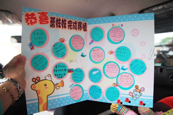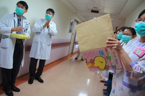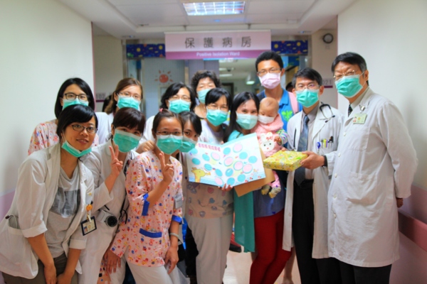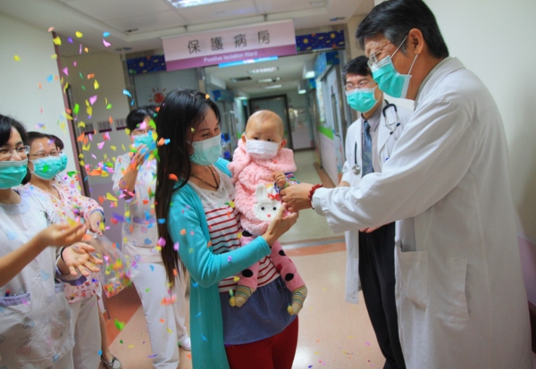 骨髓移植後第16天~我們出院了 等這一天等了漫長的兩百多個日子,幾乎日日以醫院為家的階段終於平安度過了,感謝台中榮總兒童血液腫瘤科的張德高主任跟黃芳亮醫生所帶領的醫療團隊,讓寶貝在這條艱辛的兒癌治療之路終於平安走到移植完成,更感謝榮總66病房所有的護理人員這些日子貼心又認真的照顧,還有中榮移植中心96病房的白衣天使們,給予我們移植過程不分日夜許多細心的關心與照顧,這段日子要感謝的人說也說不盡,還有一直為我們打氣的親朋好友們,謝謝你、你、妳跟您,是的!我們週邊血幹細胞異體移植順利完成,今天出院了!今天主治醫師特地用心帶領66病房的許多護理人員,幫我們辦了小小的歡送會,不僅送我們貼心的禮物跟祝福的大卡片,還告訴我們走出病房後就要一路往前走,不要再回頭,代表我們之後會順利健康,以後除了定期回診做檢查之外,希望不會再輕易踏入這裡,媽咪我完全照辦,當我走出病房我頭也沒有回,因為我再也不想讓寶貝再承受疾病的苦,但是曾經做治療的這一路點點滴滴,我將等寶貝長大後告訴她,她是這樣勇敢的度過生命的考驗,上天給予我們的磨難是為了告訴我們:「走過黑暗,就會看見陽光。」