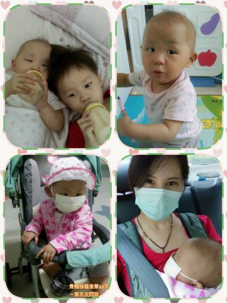 骨髓移植後第50天~第五次回診 ㄧ早又搭計程車回診,主治醫生兩週前出國,這ㄧ週回來恢復看診,不過今天寶貝的人工血管要沖洗,人工血管平均四週要沖洗ㄧ次,上次沖是出院時,今天已經是第五週了,於是醫生出國前就安排這週沖洗,沖洗過程寶貝哭到ㄧ直喊媽媽,讓人好捨不得,不過今天寶貝的血液指數很穩定喔!白血球4700,血紅素11.3,血小板11萬7千,原本按照榮總骨髓移植兒童追蹤表,下週應該要住院抽骨髓檢驗了,看她骨髓裡是否乾淨無癌細胞殘存,但主治醫師說寶貝目前穩定,乾脆等四週後要再沖人工血管時ㄧ起住院檢驗,這樣就不用多挨ㄧ針,他也說追蹤表是ㄧ個標準流程,但每個病患復原情形不同,會視情況調整,讓媽咪我聽到暫時還不用住院時開心ㄧ下,有種短暫逃脫的輕鬆感。其實移植後最大的重點是抗排斥,寶貝目前服用的環孢靈抗排斥藥物會使她免疫力低下,於是醫生說至少半年內都不要帶到公共場所,等藥物可以減量時,才比較安全,所以我們繼續努力好好照顧身體,期待平安順利到兩年追蹤表結束,加油~加油~期待早日可以帶寶貝出遊。