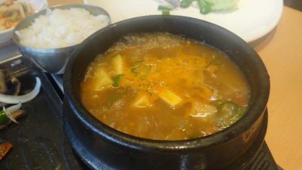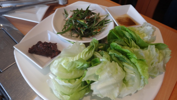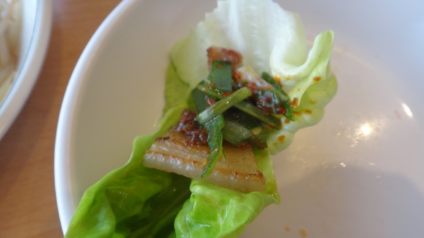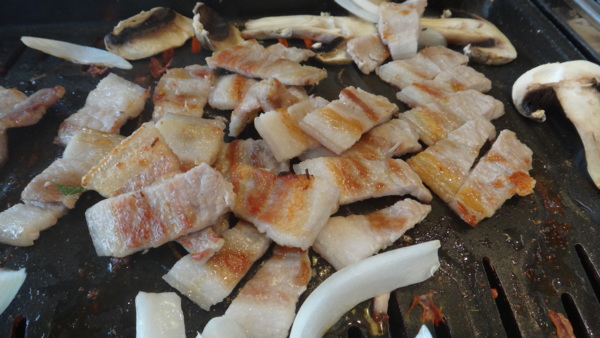 來到莫名其妙的韓國城,其實根本像一般街道,偶有幾家韓國店面與韓國人而已。烤肉跟我想像的不一樣,我們一般吃的韓式烤肉是肉片,這裡是厚厚的豬五花肉烤完再剪開,沾上胡椒鹽、韓式醬料與蔥蒜包著生菜一起吃,味道不錯,肉很厚可以吃很飽,不過我還是比較喜歡肉片的細緻口感。