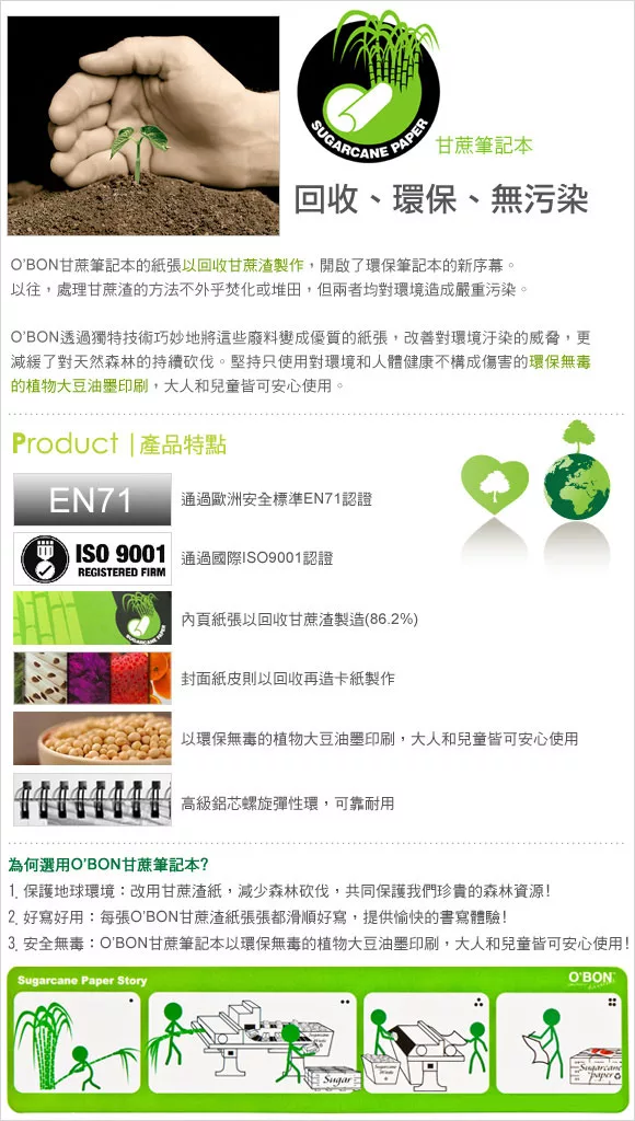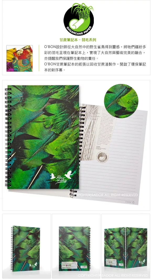 商品推薦:美國O’BON環保甘蔗筆記本(A5)藝術羽毛系列-翠綠2入