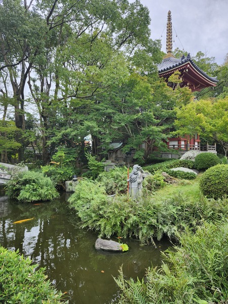 庭園中央有一棵一千多年樹齡的"逆長松".傳說有一個獵人看到山野中的空海大師.誤以為是狗熊.用箭射擊不中.卻打下一根松樹的樹枝.大師把樹枝倒種.竟然活得很好.旁邊是多寶塔.