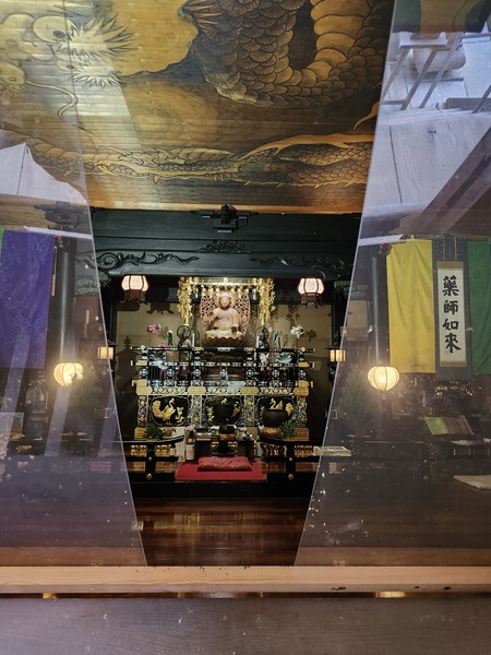 本堂天花板著名的雲龍吊頂畫.1972年由當地出身畫家製作約30張榻榻米大的巨龍.