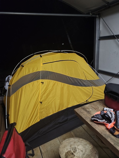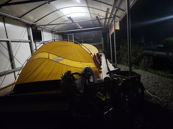 老闆爽快答應可以露營.且怕晚上下雨.要我們搭帳棚在歡迎的屋簷下.
