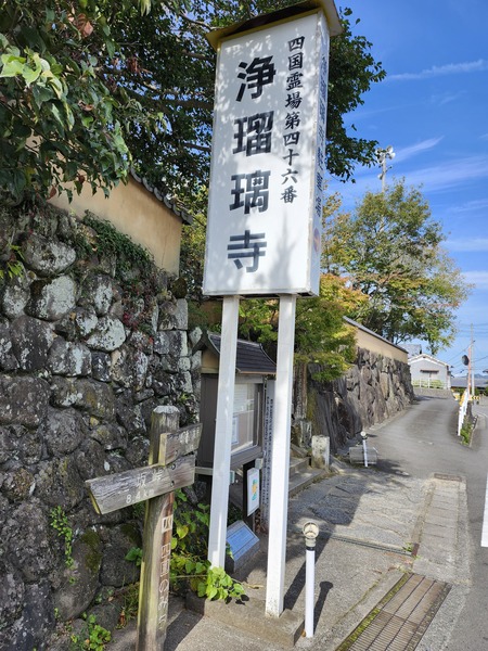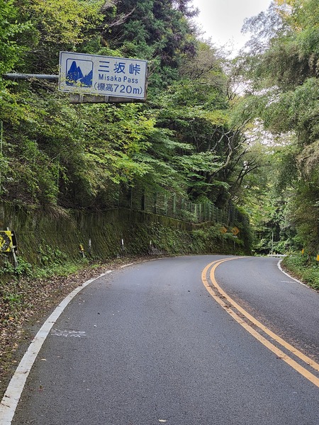 早上要爬到三坂卡.標高720米.因久萬高原町街區.海拔也有600多米.所以.沒怎麼爬坡.就到了.從這裡就一路下大坡.十幾個髮夾彎到平坦的松山市郊.在這個標示牌之前.右邊有條小路捷徑通往淨琉璃寺.但.入口處為草路.未鋪柏油路面.同伴不想進入.只得由大馬路(440國道)下山.接由陡峭下坡的農道到久谷町.
