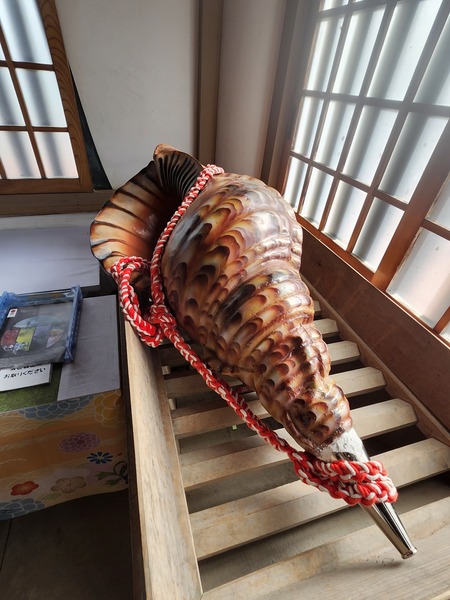 法螺.大型海螺殼製成.帶有裝飾用的繩結和金屬吹口.