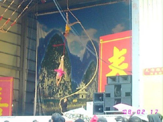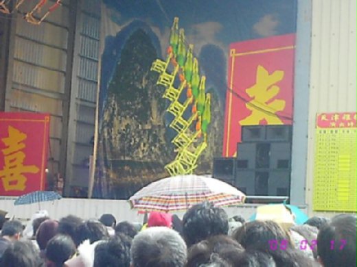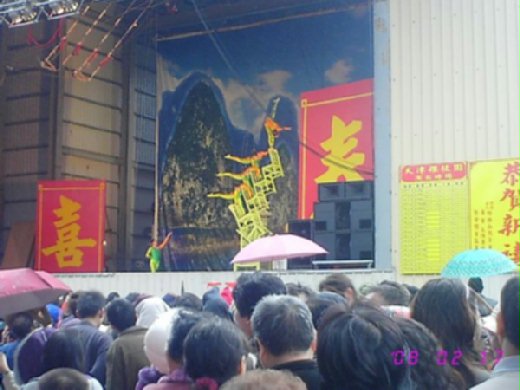 每年春節那邊都有天津雜技表演,所以今天就去看了,雖然早一小時到,但是那邊的位置還是已滿,所以只好站在旁邊看,突然聽到有騷動,原來是站著的人全都擠到台前,導至原本乖乖坐著欣賞節目的人都看不到,但雖然如此情況還不見改善,誰知看到一半天空竟然下起毛毛雨,一陣一陣的,那些人居然撐起傘,這下又引起一陣大騷動,真的很沒水準,就是有這種人,表演結束雨就開始有點大,我們先在那躲雨(那有搭雨棚),雨一下子就停了,趕忙進廟內拜拜,怕又下起雨了就沖沖離開,沒有再那邊多逛一逛。