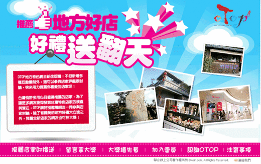 OTOP地方特色網全新改版囉!不但新增多種互動機制外,還可以參與店家評鑑跟討論,快來用力推薦你喜愛的店家吧! 台灣有許多用心且值得推薦的店家,為了讓更多網友能夠發掘台灣特色店家的樸直與實在,OTOP網特別邀請網友一同參與店家討論,除了有精美的地方好禮大方送之外,推薦全新店家的網友也可抽大獎哦! 活動時間:97年7月7日至97年7月31日,為期四週。 活動網址:http://www.otop.tw/act/message/index.html 活動方式: 心動不如馬上行動,趕快來參加吧! |
