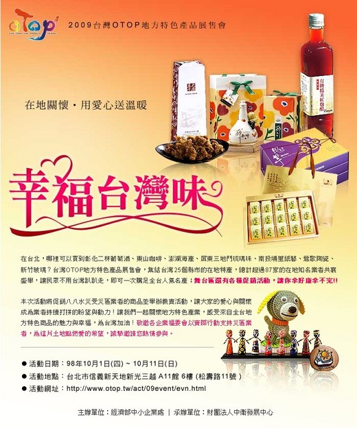 時間:上午11點至晚上9點30分 地點:台北市信義新天地新光三越 A11館 6樓 (松壽路11號 ) 網址:http://www.otop.tw/act/09event/evn.html 在台北,到哪裡可以買到彰化二林葡萄酒、東山咖啡、澎湖海產、屏東三地門琉璃珠、南投埔里紙藝、鶯歌陶瓷、新竹玻璃等,最具有台灣味的地方特色產品? 今年度經濟部中小企業處集結了台灣25縣市各鄉鎮之具地方代表性的特色商品,舉辦OTOP(One Town One Product一鄉鎮一特產)地方特色產品展售會,總計超過87家的地方業者共襄盛舉,讓民眾不用台灣趴趴走,即可輕輕鬆鬆一次購足全台人氣名產及團購訊息。 本次展售會活動適逢八八水災過後,為表達在地關懷‧用愛心送溫暖,為災區業者盡一份力量。現場將有來自「太麻里」、「台東工藝」、「那瑪夏鄉」、「三地門」、「嘉義梅山」、「屏東牡丹」等災區業者,進行商品推廣活動並舉辦義賣活動,感受來自全台地方特色商品的魅力與幸福,讓大家的愛心與關懷成為業者持續打拼的盼望與動力,歡迎踴躍參加,為台灣加油! 特別邀請企業福委會代表參與,以實際行動支持災區業者,為這片土地點燃愛的希望,主辦單位提供100份來店禮予企業福委會代表,請憑個人名片於活動期間至「台灣尚好禮區」領取。另外,協辦單位新光三越為回饋台灣OTOP地方特色產品展售會的消費者,凡活動期間於OTOP展場內消費金額滿500元者,即可憑發票於新光三越服務台免費兌換『滿額禮』,歡迎大家到現場盡情參觀選購! 為了讓消費者感受台灣特有的人情味,每日下午2點半開始於展場舞台區,有多項活動好禮等著你來拿!!活動包括一元搶標、有獎徵答、台灣大探索拼圖、幸福DIY、我是估價王…等,歡迎大家 "樓頂揪樓腳,阿公揪阿媽(台語)" 一同手牽手體驗幸福的道地台灣味!!支持OTOP,這丟係 "愛台灣" 啦!! |