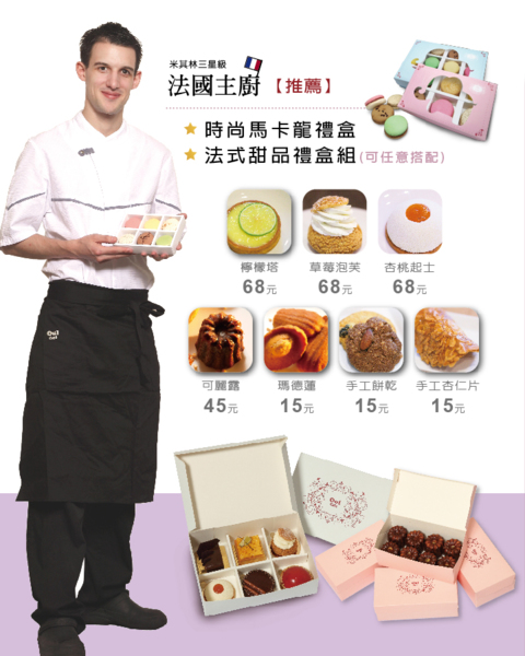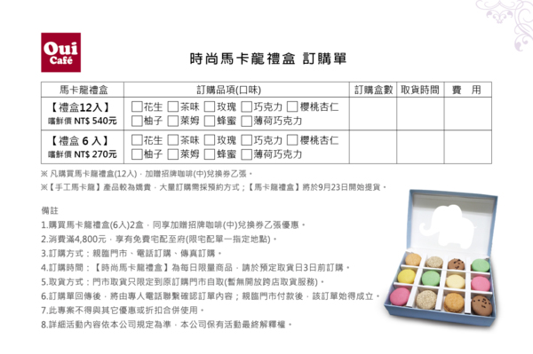 訂購流程: 1.訂購方式:採親臨門市訂購/傳真訂購,將由專人電話聯繫確認訂單內容。 2.付款方式:提貨日3天前親臨門市付款,該訂單始得成立。 3.客戶取貨:憑發票及三聯單黃聯至原購買門市取貨即可。 備註: *【時尚馬卡龍禮盒】手工製作繁瑣,為每日限量商品,請於預訂取貨日3日前 訂購並完成付款。 *購買馬卡龍禮盒(6入)2盒,同享加贈招牌咖啡(中)兌換券乙張優惠。 (如購買禮盒(12入)兩盒或禮盒(6入)四盒,即可獲得招牌咖啡兌換券兩張,以此類推) *消費滿4,800元,享有免費宅配至府(限宅配單一指定地點,限宅配於本島, 外島除外;敬請見諒)。 *取貨方式:門市取貨只限定到原訂購門市自取(暫無開放跨店取貨服務)。 *此專案不得與其它優惠或折扣合併使用。 *詳細活動內容依本公司規定為準,本公司保有活動最終解釋權。