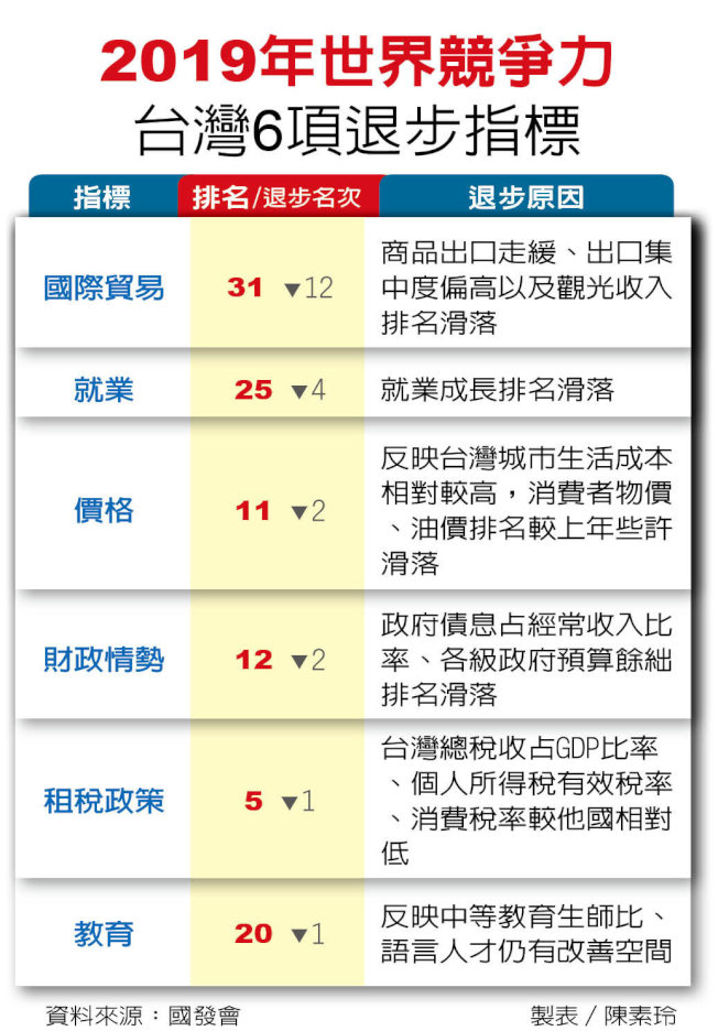 台灣在今年IMD四大評比項目的20細項指標有六項退步,其中國際貿易大幅滑落12名到31名,主要是商品出口集中度偏高,且觀光收入排名下降。