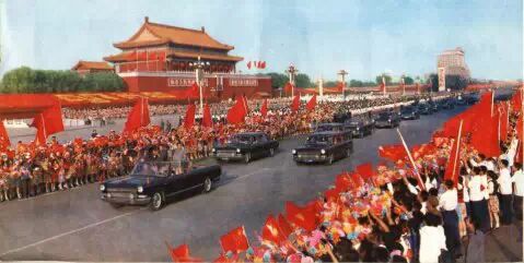 照片:北京长安街上盛大的欢迎仪式 华国锋和波尔布特站在第一辆汽车上