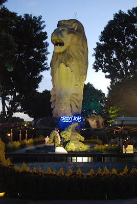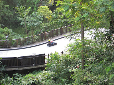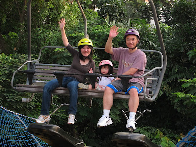 | 新加坡行,是為了幫媽媽慶祝七十歲生日,妹妹和我一同決定的。此行訂的是四天三夜自由行,旅行社代訂飯店和機票,再外加幾張門票和市區旅遊的行程,包含機場稅一個人才一萬五台幣,非常划算。 我們搭乘的是華航的早班飛機,這班飛機很新,設備也很好,每個乘客前方都有一個電視熒幕,我就是在新加坡來回的飛機上把《賽德克‧巴萊》這部電影看完的,妹妹也可以看她喜歡的卡通影片。不像我們從美國來回臺灣的達美航空,還是用老式的公共電視,害得妹妹在回美國時,上飛機後就不停地問我電視呢?遙控呢? 到了新加坡時已經是中午十二點半了,等進海關、提行李、搭上來接機的遊覽車,再沿途送其他旅客進旅館,七弄八弄,到達飯店時已經下午兩三點了。 我們住的旅館是Hotel Michael,就在聖陶沙的名勝世界(Resort World)。飯店高級舒適,從後頭一走出去就是餐廳,名店,環球影城,及各個遊樂設施,出入有單軌列車(飯店附送三天的車票),非常方便。到新加坡之前有人告訴我,住在聖陶沙離新加坡市區比較遠,不如換到市區的飯店,但是我反而覺得這兒適合遊玩住宿,如果我下次再來,還是願意再來這兒。圖為飯店大廳裏的亞當夏娃塑像。 房間裏頭很乾淨,設備也很新穎。 剛出門時妹妹穿了長褲,還有一件短袖上衣,神采奕奕。後來我們才領教到,新加坡的天氣和臺灣大不相同。 在馬來西亞美食街吃了一個簡單的午餐。 餐廳裏頭裝潢成小吃街的樣子,我們點了一盤印度飯,一碗福州乾麵,兩晚米粉,還有紅豆冰和什麼晶的。份量都很少而且口味平平。 由於我們對環球影城之類的主題樂園沒有太大的興趣,因為在美國也玩得到,所以直接到後山的公園遊樂區去看看。還好一路上山都是搭電扶梯,要不然我不相信有人會有那個能力在燠熱的天氣裏走上山去玩。 阿力叔叔說新加坡的天氣只有兩種,一種是很熱,另一種是比很熱還要熱,真是一點都沒錯。我們才走了一個多小時就已經吃不消了。 後來看她這個溫帶來的小朋友實在不行了,只好把她脫得剩下小内衣。起初她不願意,一直嚷著:「Not 好看!」後來敵不過熱氣逼人,她一不做二不休,乾脆把鞋子也脫了。有一個印度怪伯伯,看到妹妹的小胖腿大為驚艷,不停地哇啦哇啦大聲讚美,先是從後頭捏了她小腿一把,後來乾脆要求與她合影留念。 這個斜坡滑車的票是附送的,原先以為妹妹會害怕,所以有一點猶豫到底要不要玩,後來發現似乎不太危險於是決定玩他一趟。照片中妹妹等著要上車了! 輪到我們時才知道原來妹妹也需要買票,但是服務人員只提了一下就讓我們上車了。 回來的時候是搭纜車,妹妹跟我們一起東看西看,還跟外婆揮手照相,真是勇敢。不知者不罪,妹妹又坐了一趟霸王車! 搭老虎塔的旋轉電梯上去看四周的風景。 傍晚下山時拍攝的魚尾獅像。 回程在單軌列車上,妹妹堅持要像大人一樣自己抓著柱子站站,還要自己上下車。 回房間洗完澡後不久妹妹就睡着了。