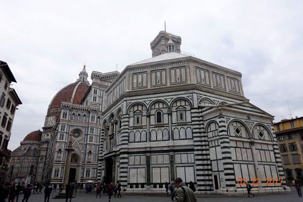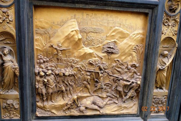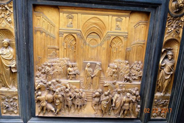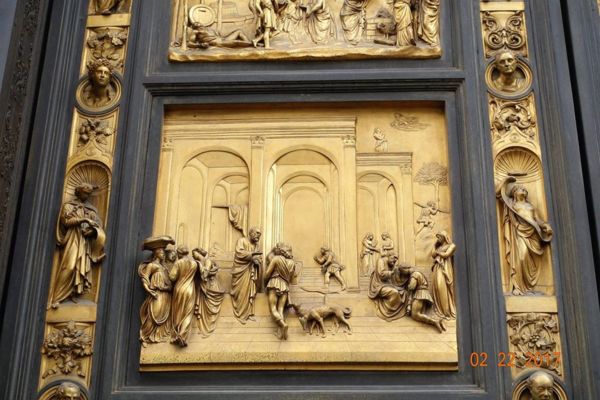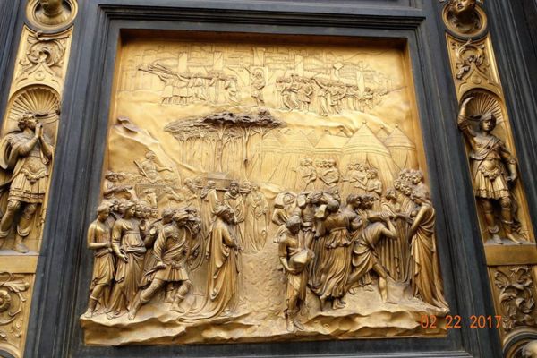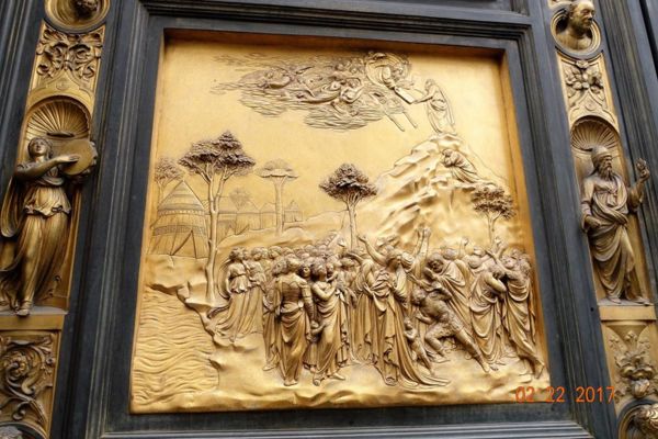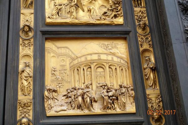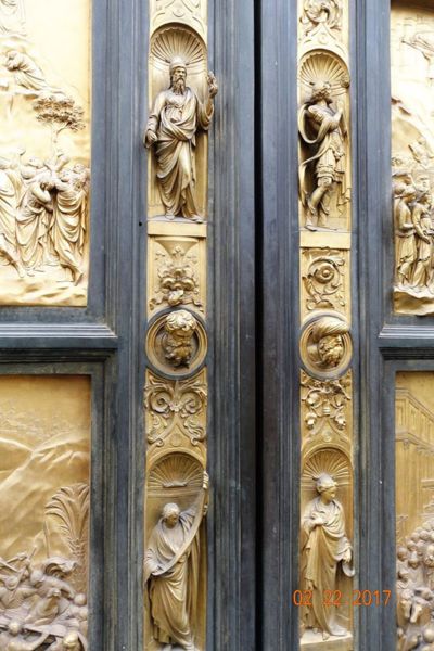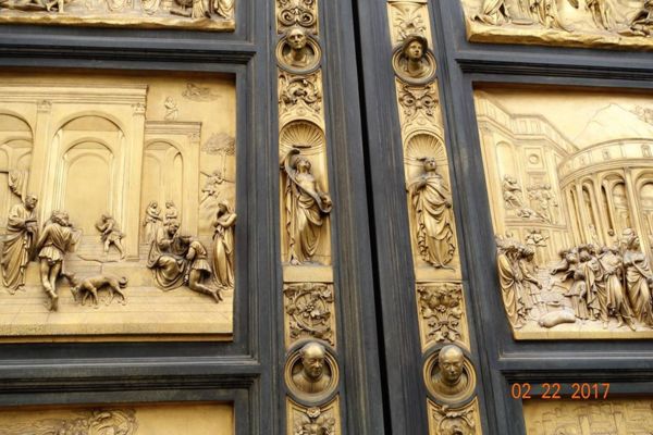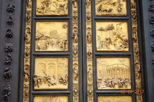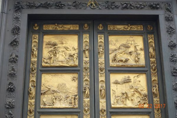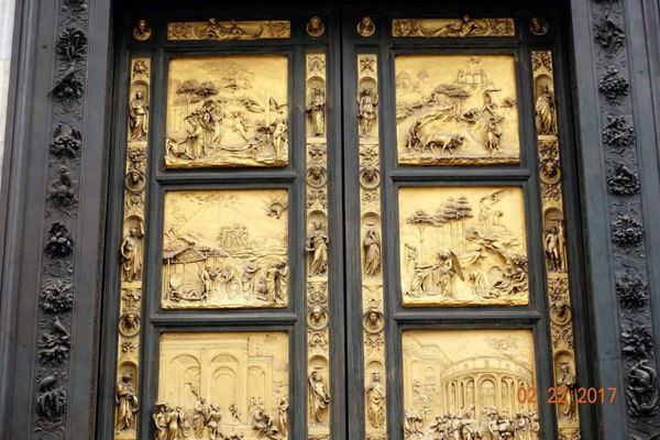 洗禮堂八面的柱狀體,共有三面做成大門可進出。東面也是最著名的天堂之門,由吉勃第(Ghiberti)規劃,共有10塊浮雕,以透視法描述舊約故事。