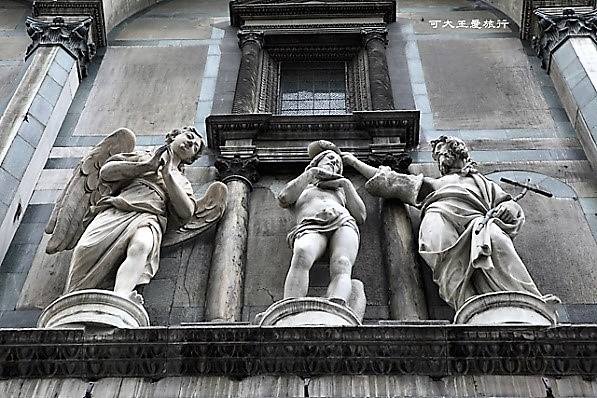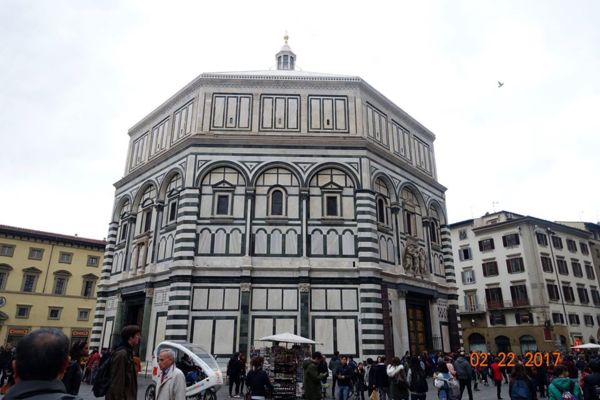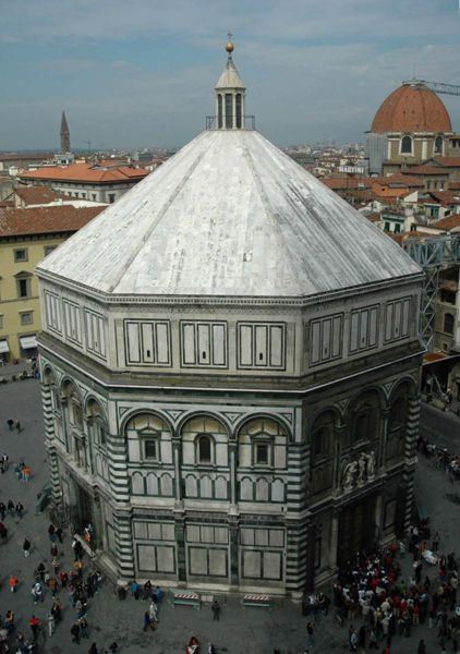 這張是網圖 聖喬凡尼洗禮堂現在的外觀可追述到西元 11~ 13 世紀;光潔的棱錐形屋頂建於 1128 年。其外部用綠白大理石裝飾。建築的每一面縱向橫向都呈三三三制結構,以壁柱、拱券、石條作相間裝飾。中間一層則開了一圈窗戶。