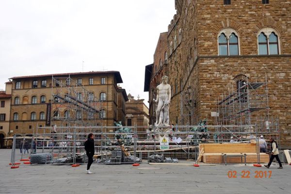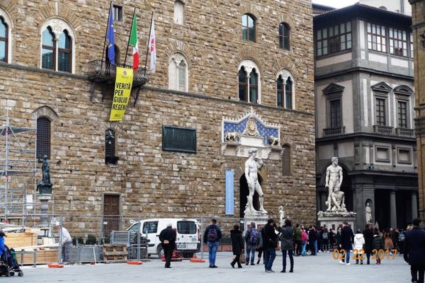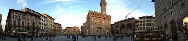 領主廣場全景(網圖) 翡冷翠市政廳廣場 =領主廣場Piazza della Signoria, Florence 是義大利佛羅倫斯舊宮前的「L」形廣場,得名於舊宮(=領主宮=維奇奧宮 Palazzo Vecchio”,也是現在的市政廳!)。 這裡是佛羅倫斯共和國起源與歷史的焦點,多個世紀來這裡是翡冷翠城邦的政經文化中心,至今仍享有該市政治中心的名聲。這裡是佛羅倫斯人以及眾多遊客的聚會地點。