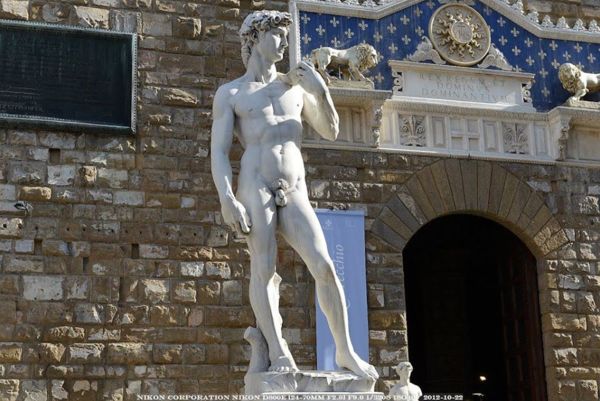 哇!老公頭頂著DAVID! 早期大衛像的裸露曾引起爭議,被穿上28片銅製無花果樹葉來遮羞。雕像也曾經被貼上金箔葉子,頭上戴有金質花環,但這些裝飾後來都遺失了。