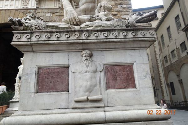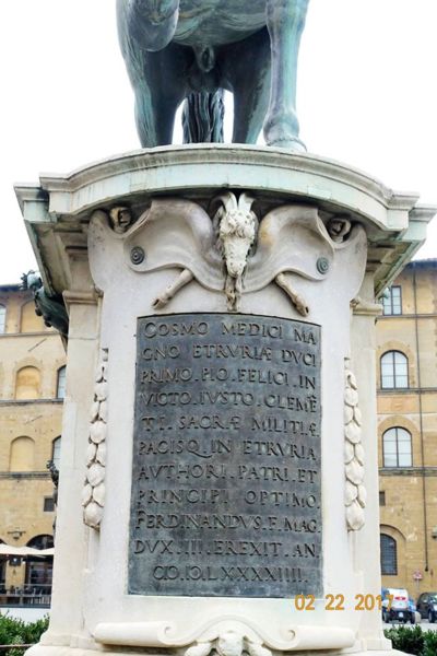 下面雕的是科西莫征服錫耶那(Siena)的事蹟--神聖羅馬帝國國王查理五世依靠科西莫的支持對抗法國,科西莫也利用查理五世的力量於1559年併吞Siena 馬蹄下的是梅迪奇家族的家徽