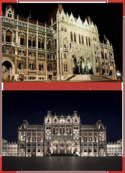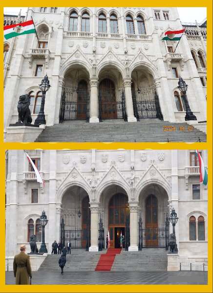國會大廈背靠多瑙河,正門外是科蘇特廣場,兩尊銅獅雄踞正門兩旁 *下--有重要貴賓來訪時,才會舖紅毯、開大門!(網圖)