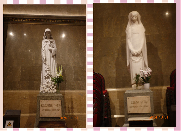 左--聖女小德蘭雕像(Saint Thérèse of Lisieux) ※她被稱為「小花」或「耶穌的小花」。 ※她是一位法國的加爾默羅會修女,以其「小道」靈修方式聞名,強調在日常生活中以愛行事,並全心信賴天主。 ※她是傳教士、花匠、飛行員以及許多病患(特別是結核病患者)的主保聖人。 右--聖麗達(Saint Rita)雕像 ※聖麗達出生於義大利,一生中經歷了許多困難,包括婚姻問題、喪子之痛,最終成為奧斯定修女,是天主教的聖人,被稱為「不可能原因的守護神」和「調解者」。