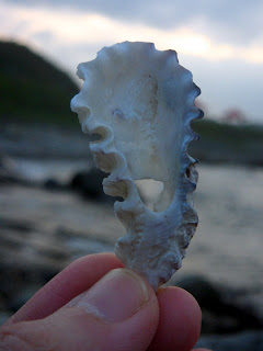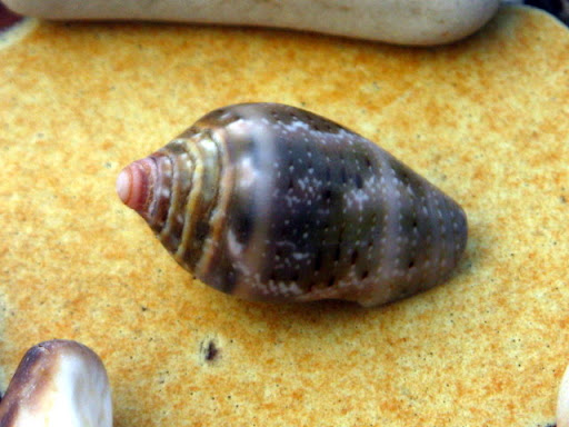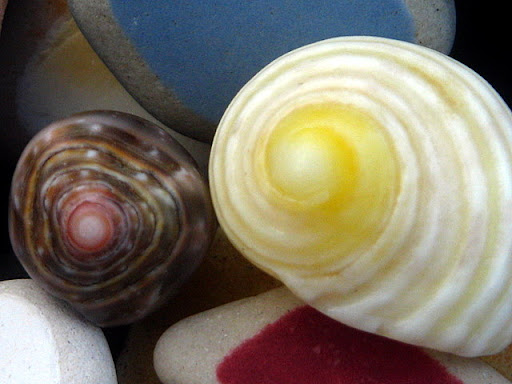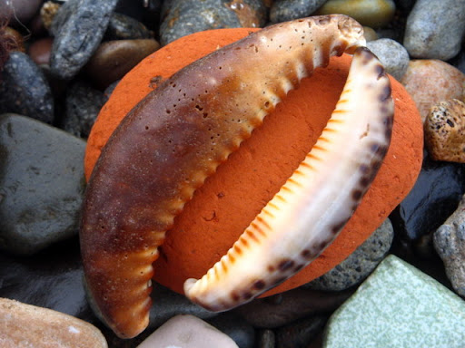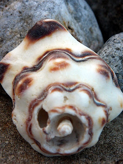 不需任何金錢, 不需等待情人節, 這是海洋之花, 獻給有情的人。 如果你覺得單一朵不足以表白心意, 那麼海洋還提供了由花青螺、花笠螺所組成的星星捧花---- 這獨一無二, 一期一會的花朵, 你要將這海的誓言,獻給誰? 不經意地, 她讓我看見了她。 一行字句中,不起眼的小逗點, 卻逗的我心花怒放! 她身上的紋路如雨絲溫潤光澤, 我不想將她歸類到貝殼圖鑑的任一項, 因為她是那樣獨一無二的美啊! 看見了嗎? 她身上的漩渦,並不如一般貝殼的平整規矩, 我想像著,她身處過的世界,可能只是一小小縫隙, 所以造就了她略微三角形的螺塔。 大自然的手將她任意揉捏塑造, 比起其他同類,她知道自己是被特別對待了。 既然不能隨眾成圓, 那就成為獨一無二的自己吧! 這美麗的小貝,曾經讓我興起私心,想帶她回家收藏。 但最後,我只留下她的樣子。 她是屬於海洋的,任何人都不配擁有她。 黑星寶螺和叢雲寶螺留下的單邊牙齒, 讓我開始在海灘上玩耍起來!
