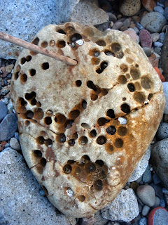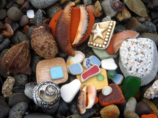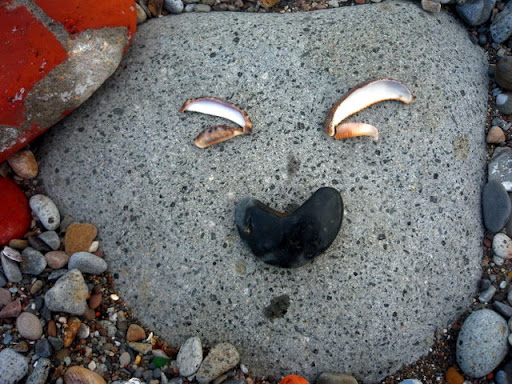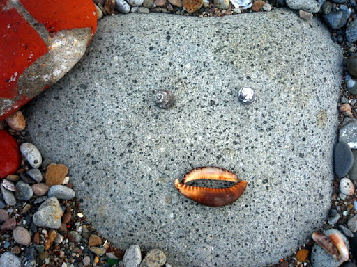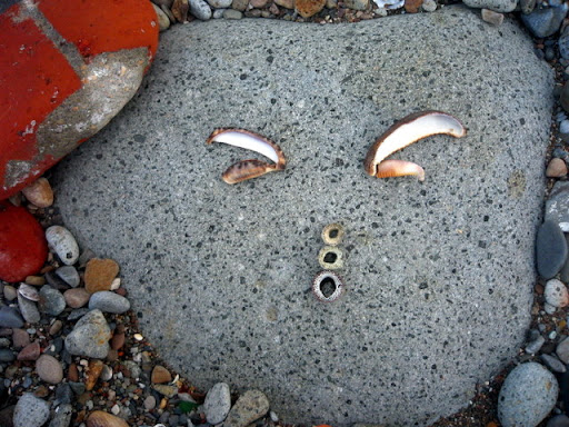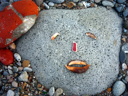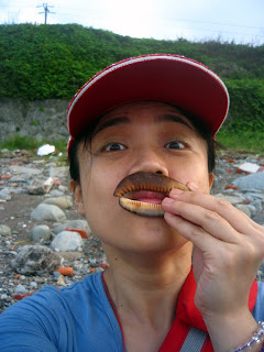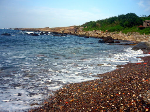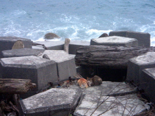 躺在三角御飯糰旁邊的河豚, 不知為什麼興奮的臉紅紅的鵝卵石, 被淘洗的像花瓣的角岩螺, 和裸露出珍珠內裡的黑鐘螺。 海水將他們粗暴地搓揉,破壞了生命的外貌型態, 還以海洋允許的溫柔色彩。 在石頭的靜思語錄中, 竟有傢伙不跟著大家一起靜坐冥想, 賊手賊腳的爬過石頭們的軀體: 「哎~借過借過!我趕著去另一頭喝小米酒呢!」 「哎!別爬別爬了!好癢呢!呵呵~」 石頭們在寄居蟹的搔癢中,再也端不住沈默的架子,笑著笑著滾進了海裡、、、 要我說出天底下最令人痛恨的幾樣事物, 其中一樣,一定會是消波塊! 這些海邊的水泥粽子成了全世界海岸線的頭號殺手! 不但破壞近海生態, 還因填阻效應,讓沿海的浪更加洶湧,更加侵蝕。 這就像一個感冒的人去求醫,醫生為了飽中私囊,開了立即見效的特校藥。 感冒雖然好了,可是特校藥的毒素卻囤積在五臟六腑。 再下一次生病,就更加重藥性,一次次地添加上去, 以毒攻毒,日積月累,惡性循環,無法消除。 每次見到這些水泥粽子, 嘴巴總會忍不住開始想詛咒那些從中圖利的官商! 只是今天,有了兩隻可愛的貓咪蹲在這裡 納涼, 看在貓的份上, 這次饒過你們! 在海邊, 從磚頭的形式、花樣、色彩, 常常可以看見台灣建築業界幾十年的改變! 在人們粗暴的行動中, 海洋從不吝嗇包容, 並將這些雜亂用溫柔的方式, 還給世間。