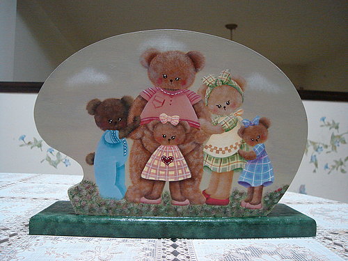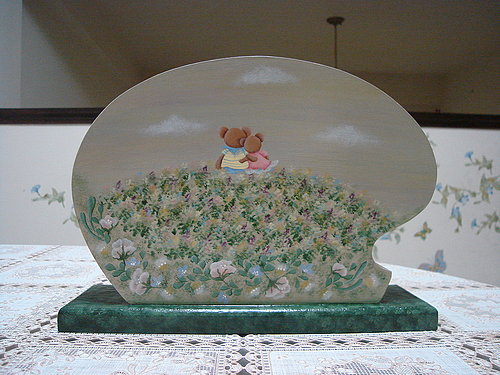前陣子全家人在假日陪先生到公司加班, 突然發現他的筆筒僅僅以玻璃瓶替代, 這讓我燃起想送一個禮物給他的念頭, 所以花了兩堂課的時間, 做一件愛的筆筒送給他。 這個筆筒相當有意境喔! 從談戀愛的情景, 透過〝執子之手、與子偕老〞的約定, 到現在兒女成群的景象, 全都在這筆筒上顯露無遺, 連老師看了都覺得雞皮疙瘩掉滿地, 直說我太噁心了! 但是要這樣才有感情,不是嗎? 應該這星期會親自送到他辦公室吧! 好期待看見他收禮物的表情喔!