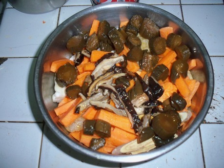 ◄ 將鋁鍋放進電鍋內,再倒入兩杯水蒸煮食材,約三十分鐘後電鍋跳起再悶二十分鐘。