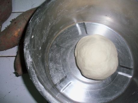 ◄ 先倒入60cc熱水,再放一小匙食鹽,最後再倒入20cc冷水,然後開始揉麵糰至三光。