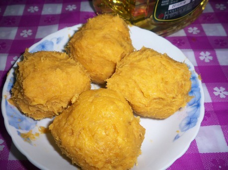 ◄ 再將地瓜泥揉成球狀,外緣沾少許食用油,塗抹於餅皮上較不會黏手。