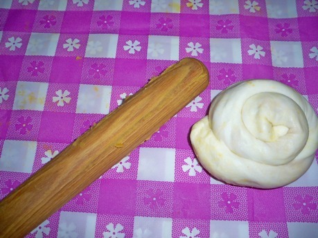 ◄ 捲成條狀後,雙手抓兩端將麵條甩長。(可參考蔥油餅的製作)