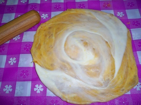 ◄ 捲好後再次擀開,擀出一張厚實、爆漿的地瓜餅雛型。