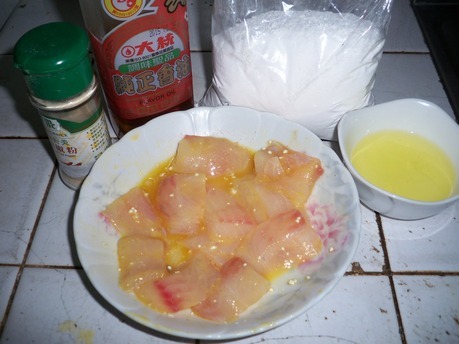 ◄ 將將魚片切成同等大小的魚片後,加入全蛋液與適量的白胡椒粉及麻油醃漬,然後再裹上地瓜粉。 ( 麻油廠牌是錯誤示範 )