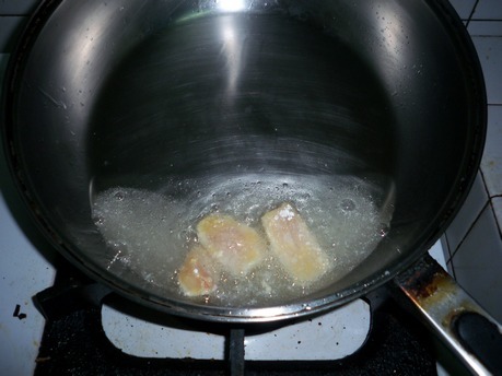 ◄ 魚片以中大火炸四十秒後撈起瀝油。