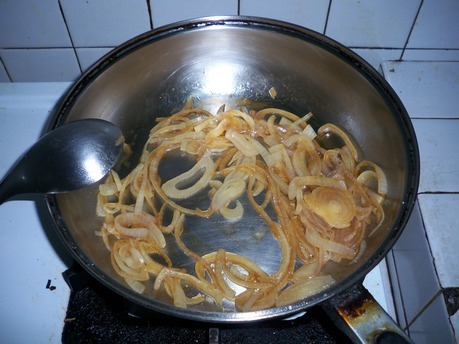 ◄ 用餘油將洋蔥炒軟並倒入適量醬油。