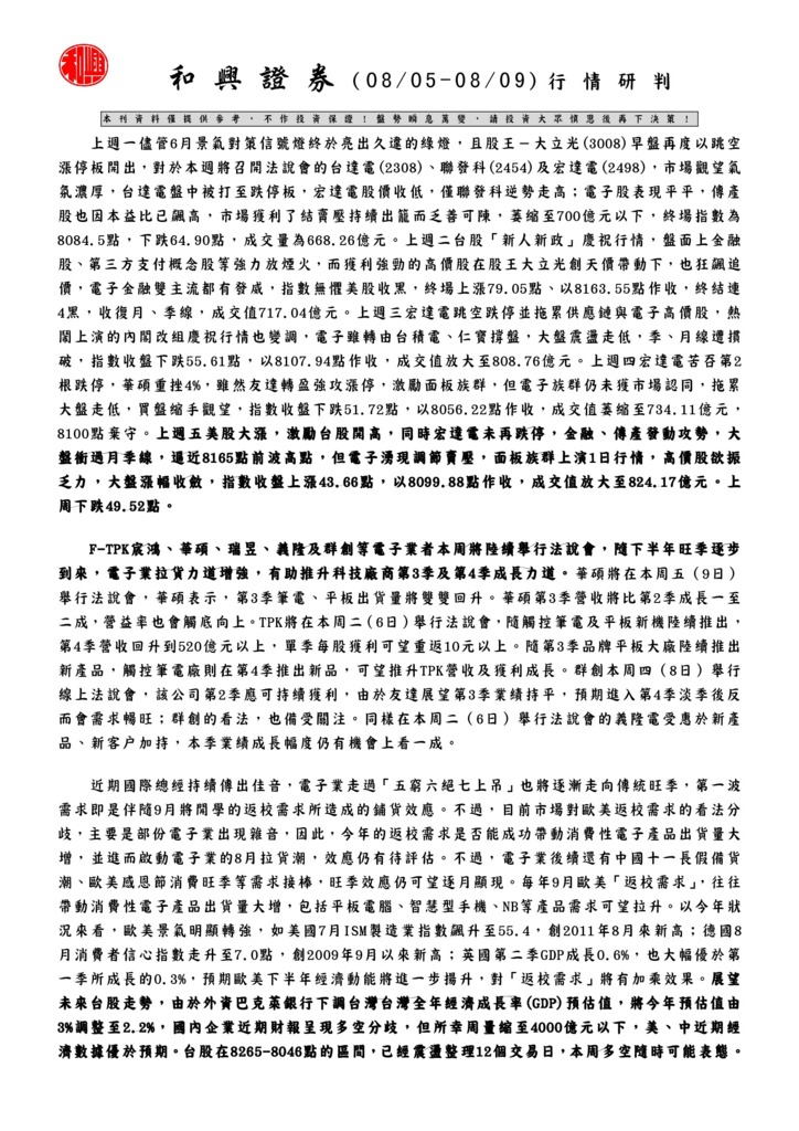 和興證券投資週報(2013/08/05-2013/08/09)