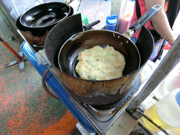 其實他們賣的是歐姆蛋+飯,用一顆蛋煎30銖,2顆蛋煎35銖。一開始我看到價格想說~哇,一個炒蛋賣30銖但看到人排隊也想試吃一下,買了才知道我誤會他們了;而且飯會比一般攤販或美食街配的飯好吃。習慣吃台灣米的我,實在吞不下泰國米。 這是泰式歐姆蛋,泰文是 Khai Jiao Moo Sab (凱叫母剎)