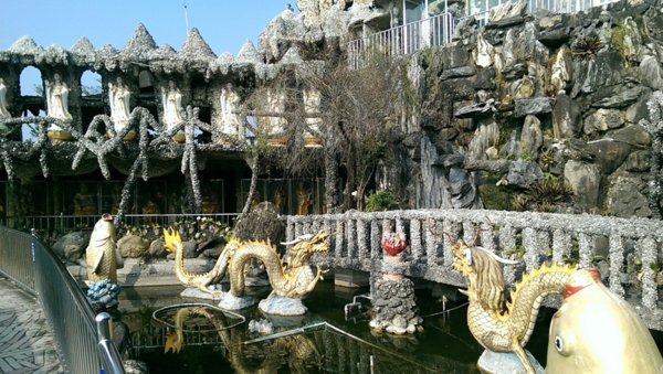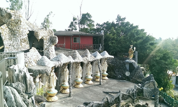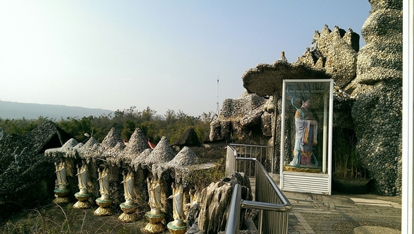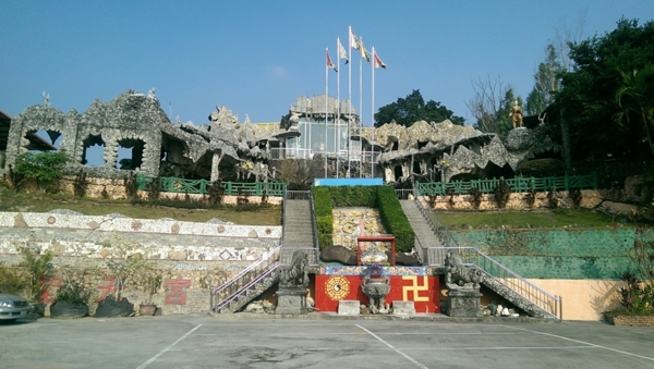 歐飛看過用石頭蓋的原住民石板屋,卻第一次聽說有間<石頭廟>,覺得很奇特非看不可,馬上查了資料輸入地址請谷哥帶路前往。而這間廟背後有著一段台、泰人民由怨轉為互助的感人故事,造就一句「台灣人博真情,泰勞感恩建奇廟」的地方美言。 簡單說是有一群近五百人泰勞當時來台受聘於某營造商興建現在的國道3號,因營造商周轉不靈倒閉,泰勞因生活產生困境也回不了泰國,住持師父幫忙向外求援及救濟讓泰勞充飢,當時普陀山即石頭廟正在擴建中,泰勞不願白吃,希望能為廟方貢獻心力,協助完成這座石頭廟。更詳細的故事可到廟方官網查看。