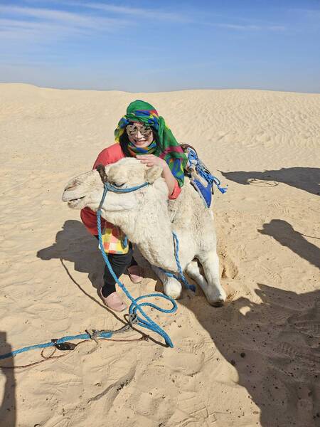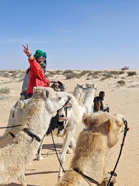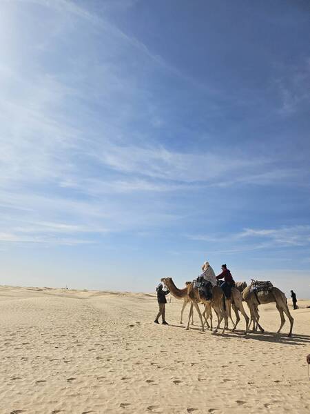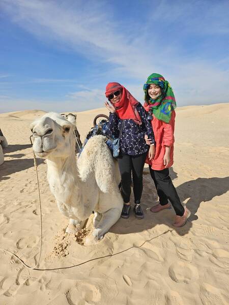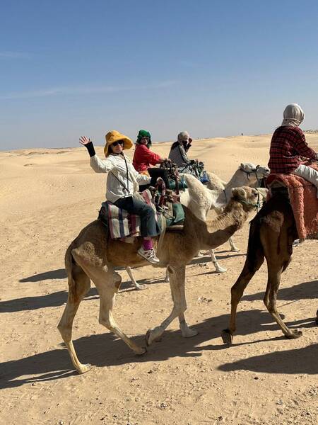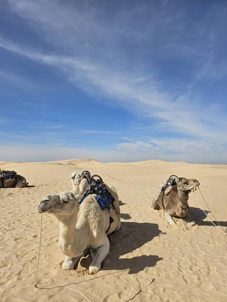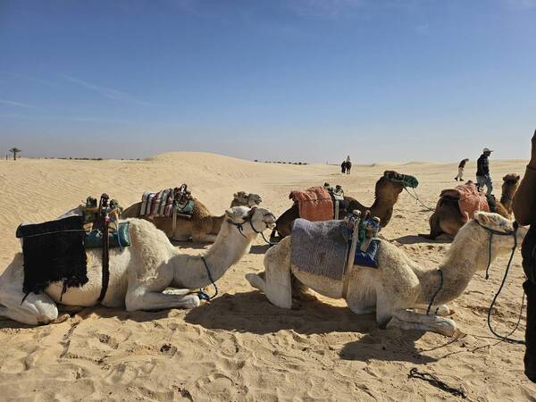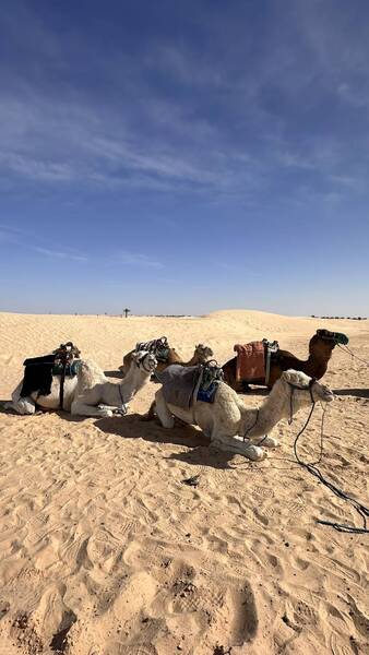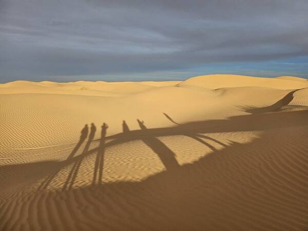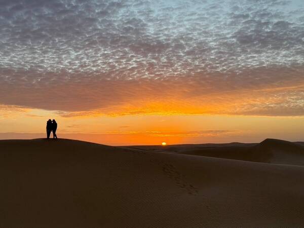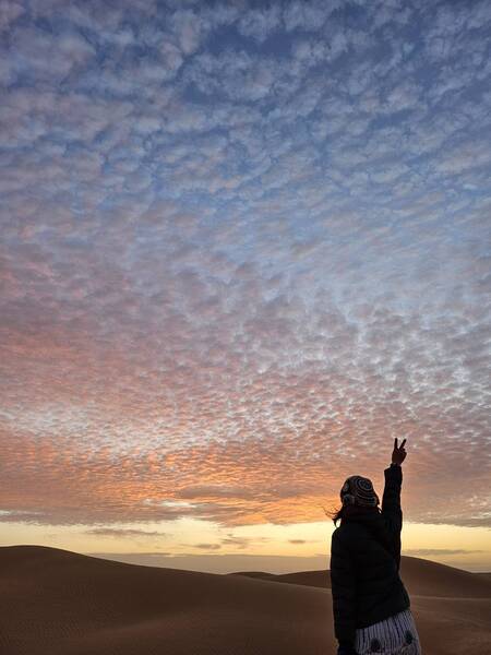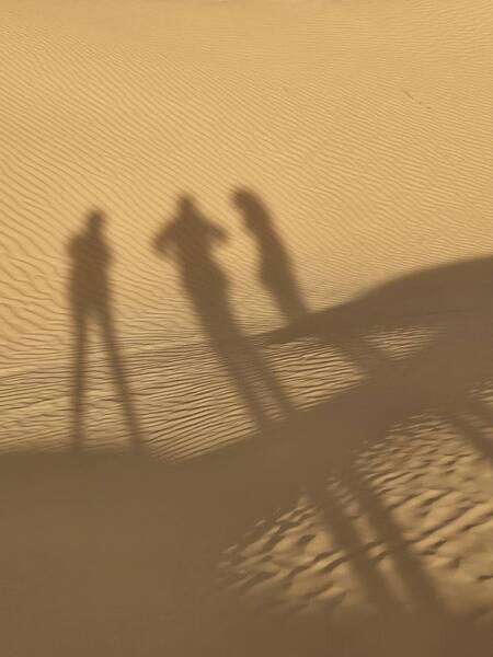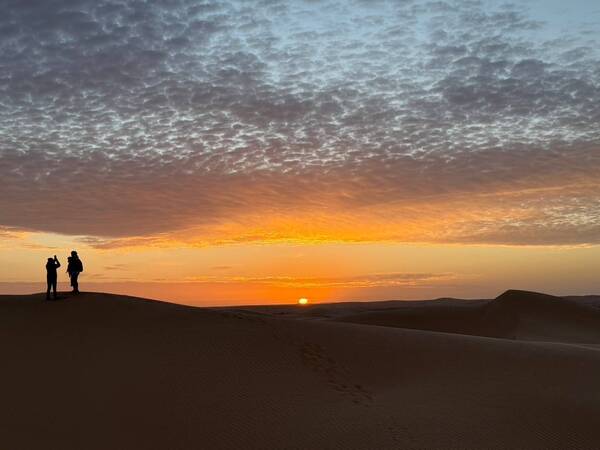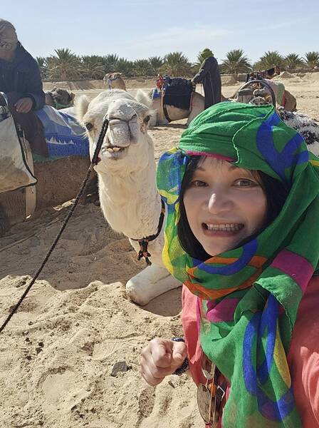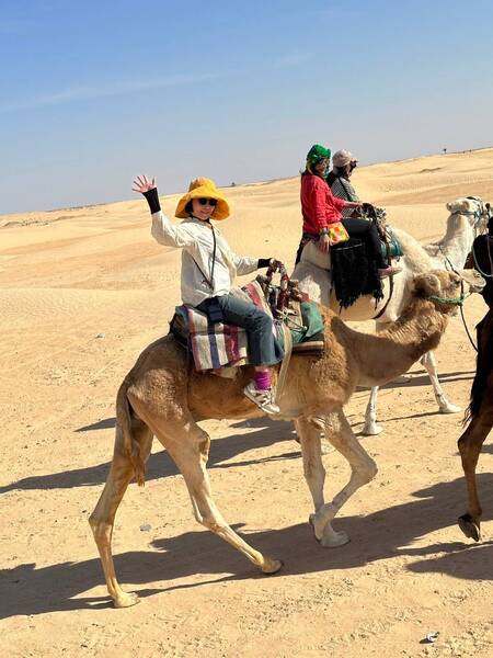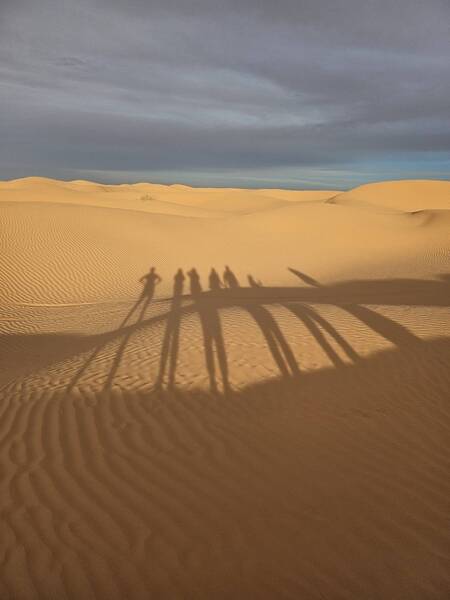 當我坐上牠的背,那瞬間, 我彷彿成了流浪在時光中的沙漠旅人。 駱駝緩慢地行走,它的步伐如同沙漠的呼吸,穩定而安詳。 起伏的沙丘宛如靜臥的巨人, 陽光灑在沙面上,反射出金屬般的光澤, 彷彿每一粒沙都藏著撒哈拉的秘密。