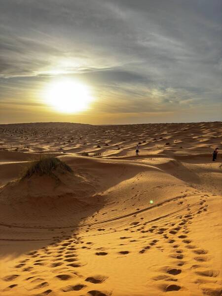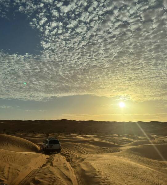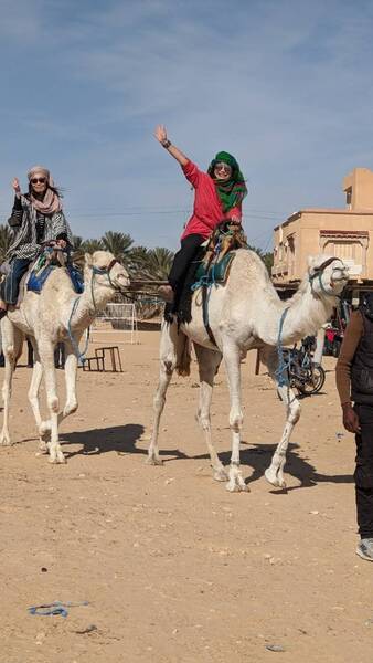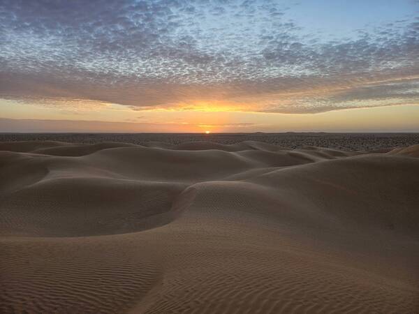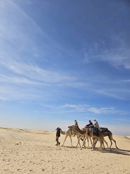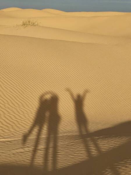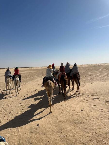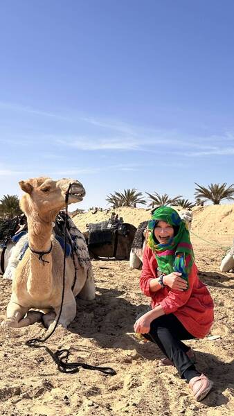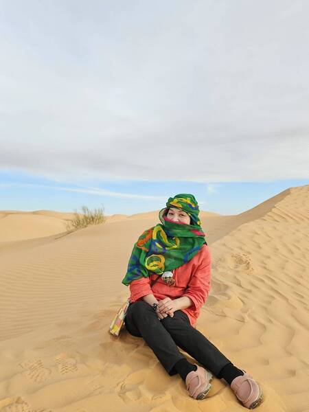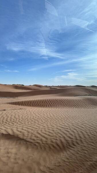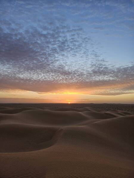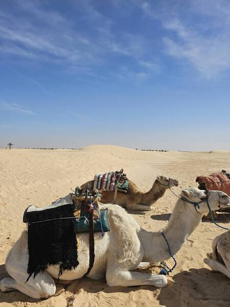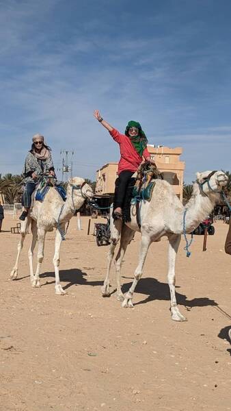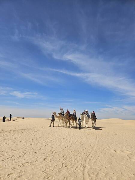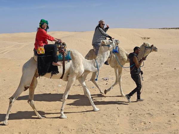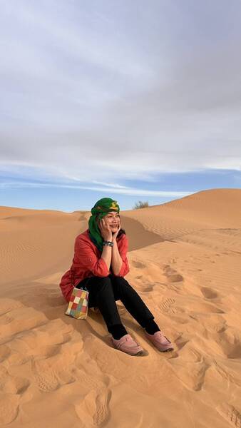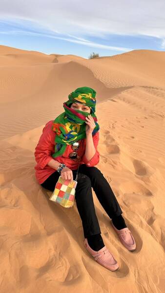 當我坐上牠的背,那瞬間, 我彷彿成了流浪在時光中的沙漠旅人。 駱駝緩慢地行走,它的步伐如同沙漠的呼吸,穩定而安詳。 起伏的沙丘宛如靜臥的巨人, 陽光灑在沙面上,反射出金屬般的光澤, 彷彿每一粒沙都藏著撒哈拉的秘密。