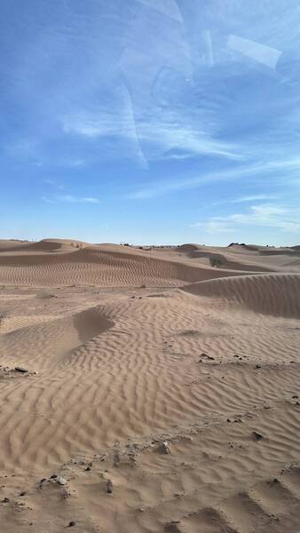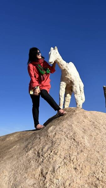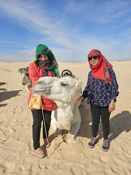午後,陽光從天際灑下,金黃色的沙海綿延無邊。 站在沙丘之上,四周寂靜得只聽得到風的低語。 我輕輕靠近駱駝, 它那溫柔的眼神像是對沙漠的千百年回應。