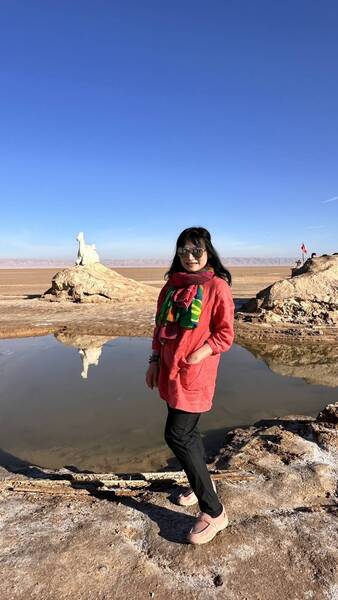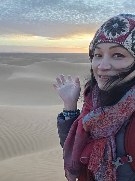 微風拂過臉頰,攜帶著乾燥的氣息和一絲熱浪, 但在這遼闊的天地間, 感覺到的卻是無比的自由與平靜。 行進中,我看到沙漠植物倔強地生長, 枝葉微微發黃卻充滿生命的韌性; 耳邊偶爾傳來遠處駱駝的低吟聲, 像是一種古老的吟唱, 迴響在無垠的沙原之上。 我試著閉上眼睛,隨著駱駝的節奏輕輕搖晃, 彷彿身體融入了這片土地,與這片無垠的黃沙融為一體。 當太陽逐漸西斜,沙漠的色彩變得溫潤, 深橙與淡粉交織出夢幻的畫面。 我停下來,靜靜地坐在駱駝旁, 看著地平線的盡頭逐漸被晚霞吞沒。 一種奇妙的寧靜和感動湧上心頭。 在這片歷經千百年風沙的土地上, 我是那麼渺小,但又如此真實地存在著。 駱駝抬起頭,望向遠方,好像看見了什麼。 或許它在提醒我,旅程雖然美麗,但總有終點。