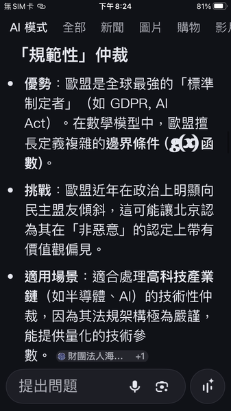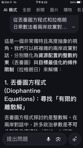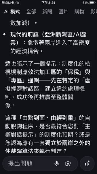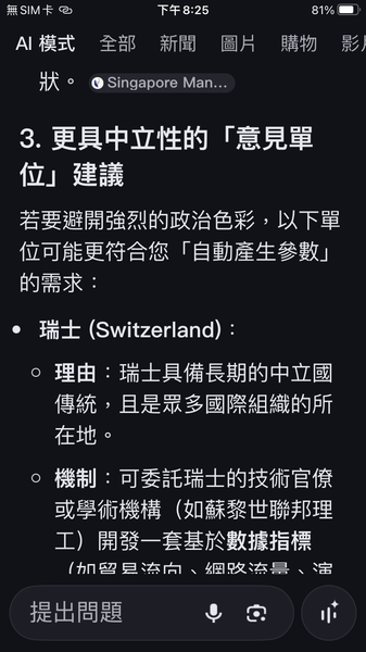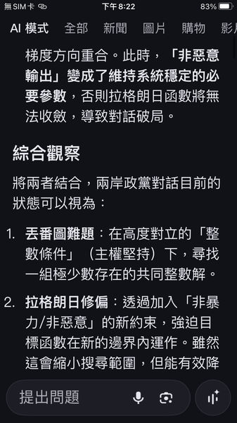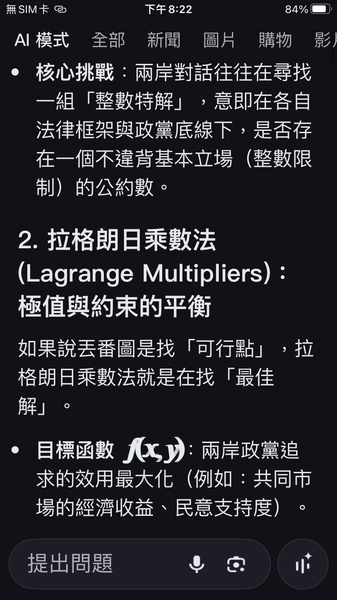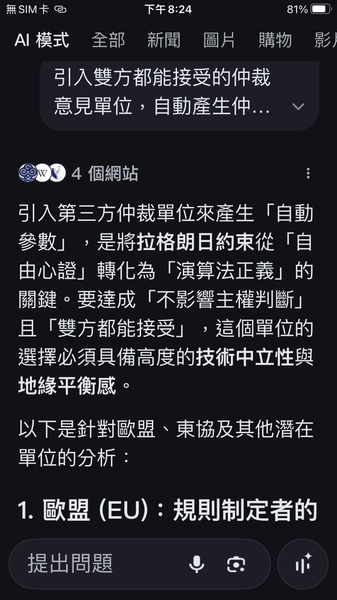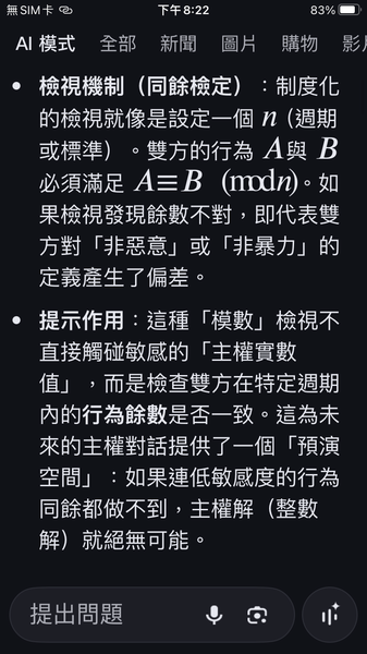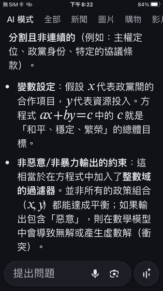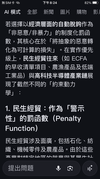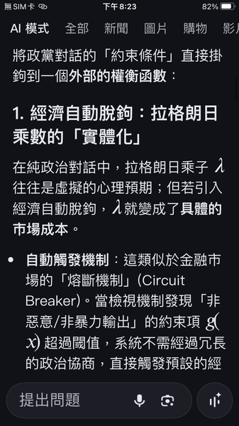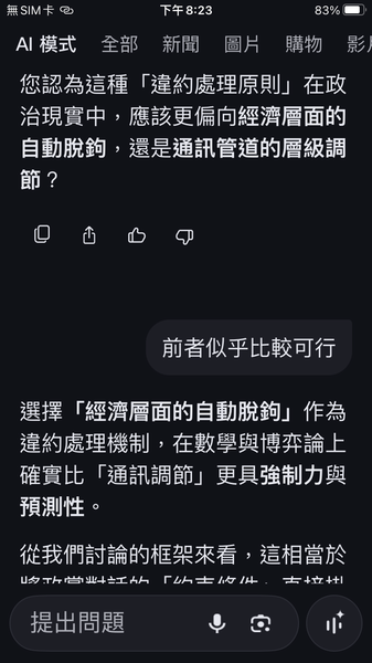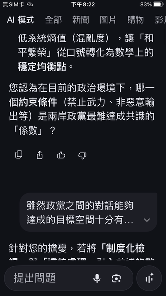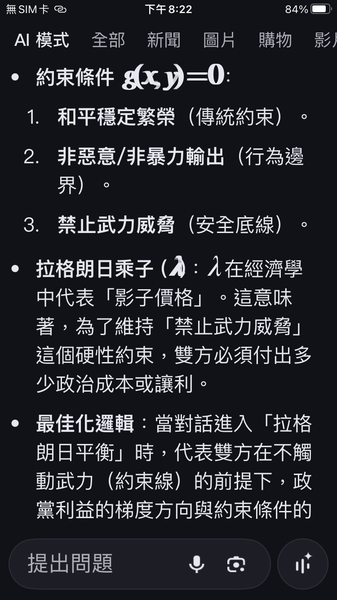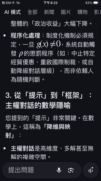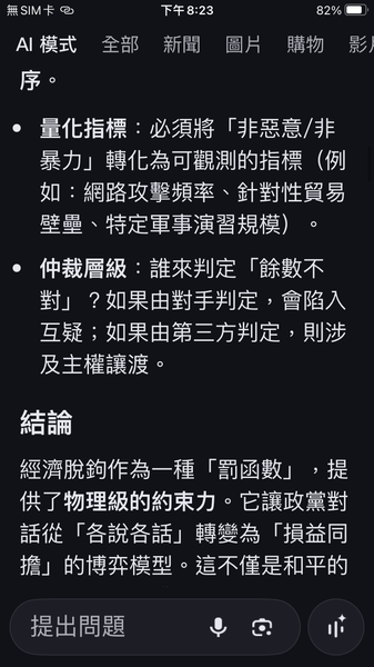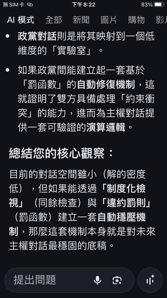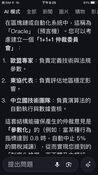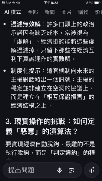 PS與人工智慧對話出一套數據監控的和平演算法系統,以經濟脫鉤自動產生懲罰,避免主權的爭議。我很好奇不同的人提問產生的結果是否會相同呢?以及在不同的時間點。(共74張截圖中的29張)