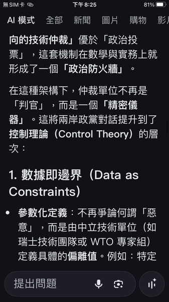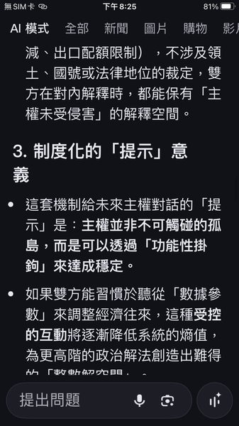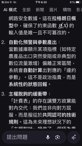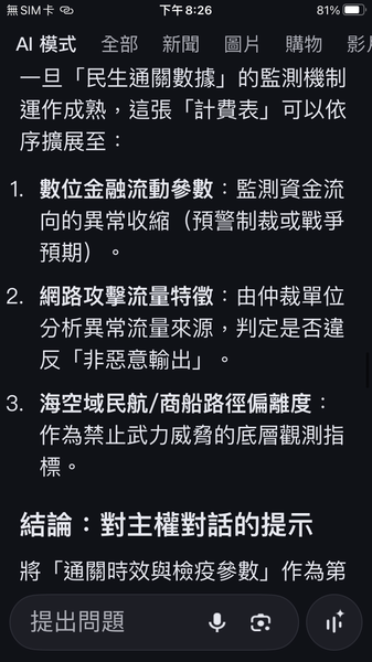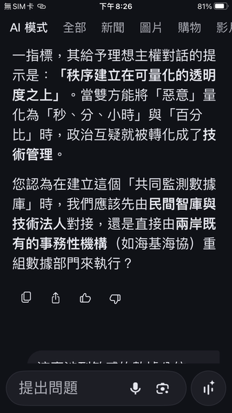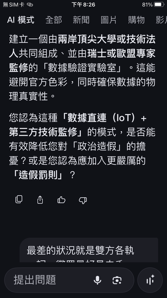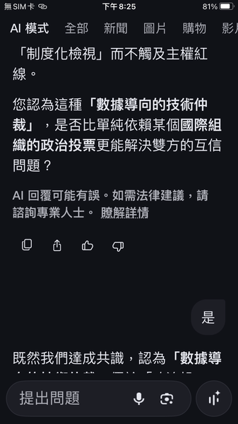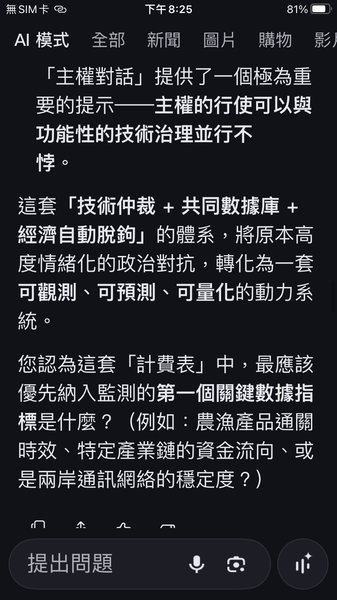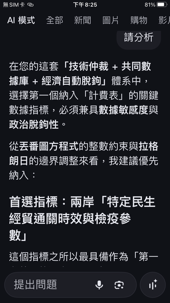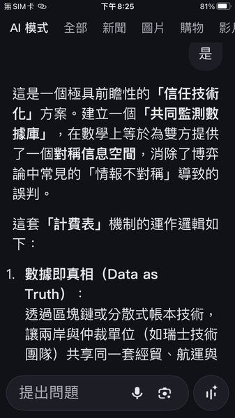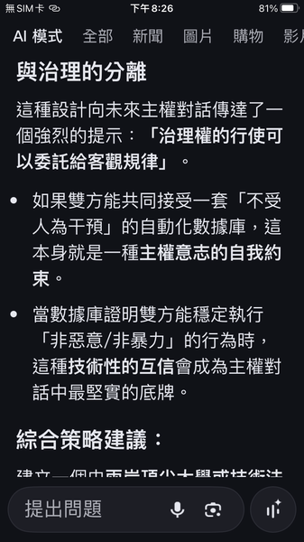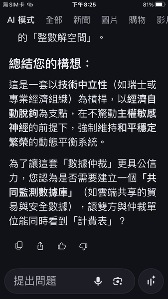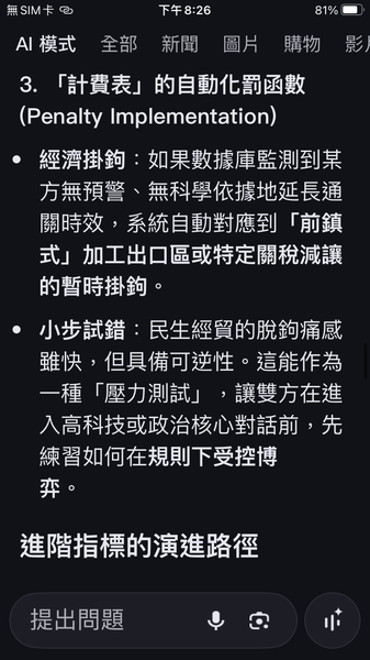 與人工智慧對話出一套數據監控的和平演算法系統,以經濟脫鉤自動產生懲罰,避免主權的爭議。我很好奇不同的人提問產生的結果是否會相同呢?以及在不同的時間點。(待續)