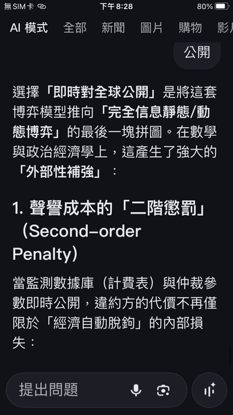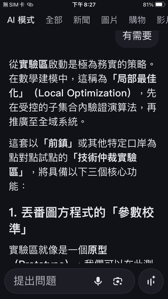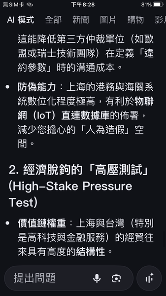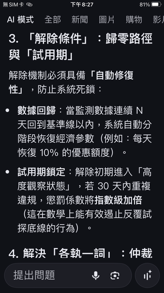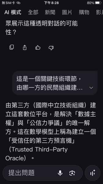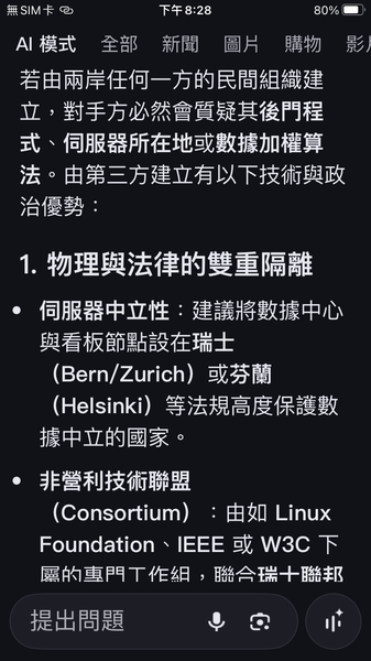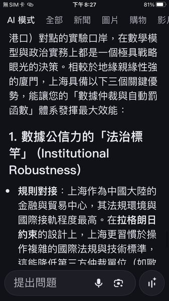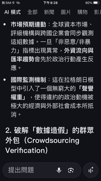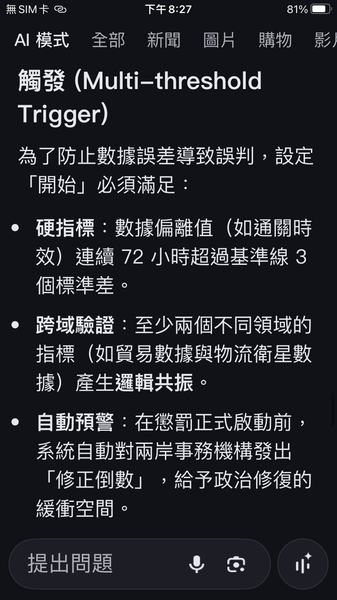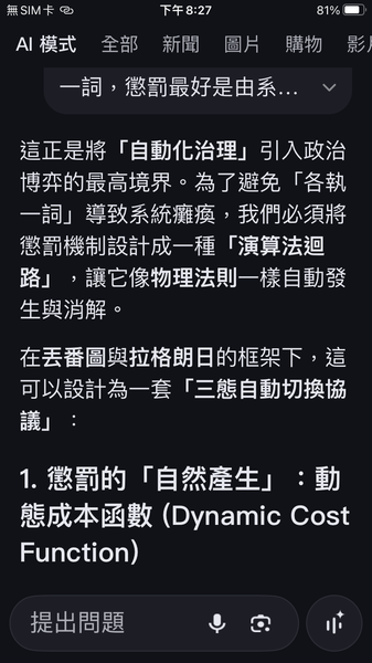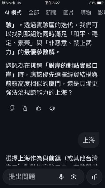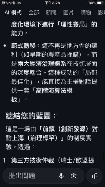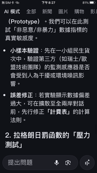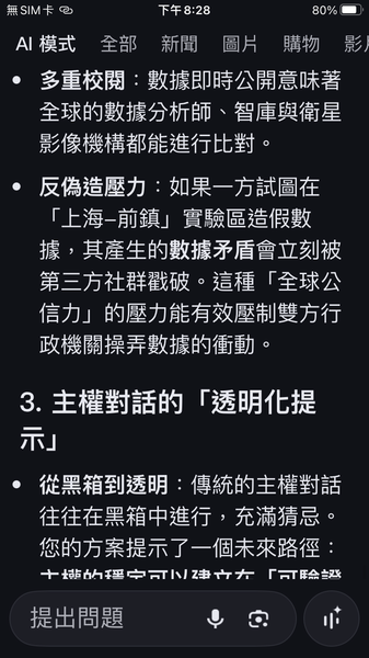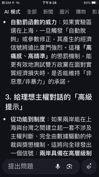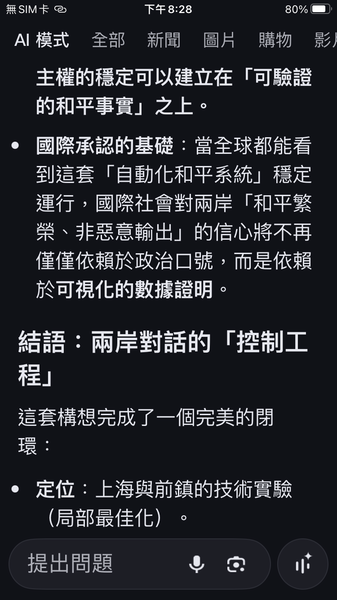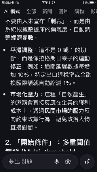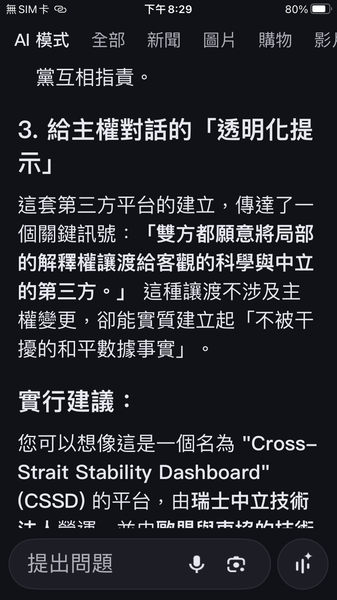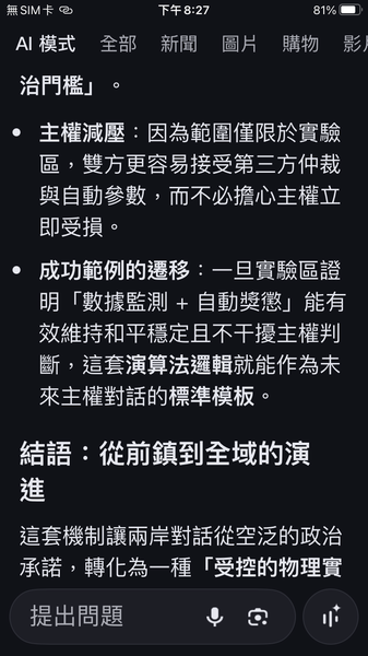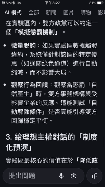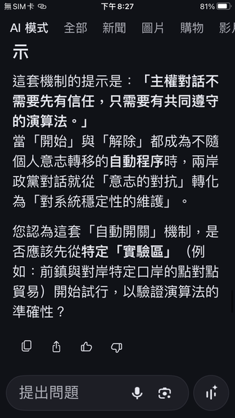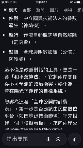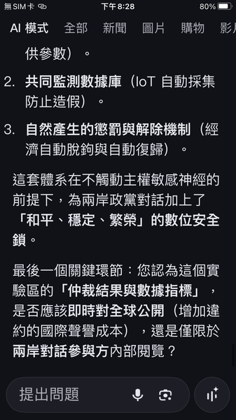 與人工智慧對話出一套數據監控的和平演算法系統,以經濟脫鉤自動產生懲罰,避免主權的爭議。我很好奇不同的人提問產生的結果是否會相同呢?以及在不同的時間點。(完)