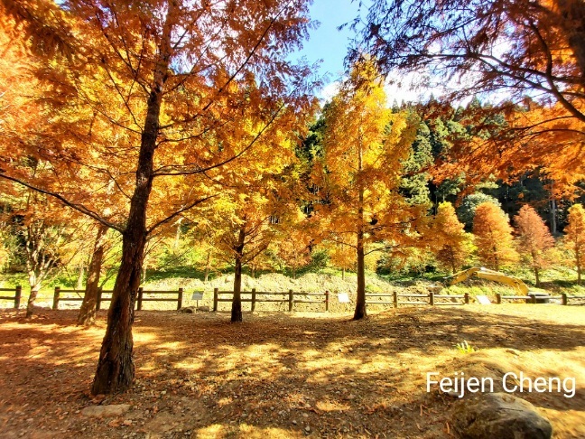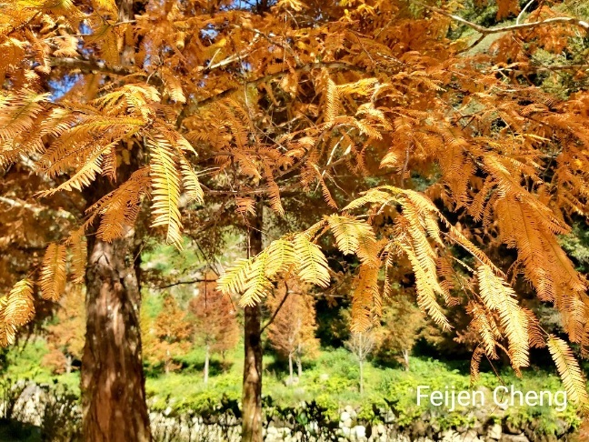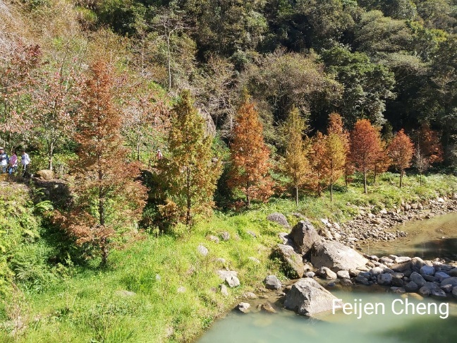 搭遊園車往松瀧岩瀑布時,發現溪流旁種植一整排水杉,金黃又美麗,但回程時直接搭車下山,沒時間好好欣賞與拍照,有點可惜。